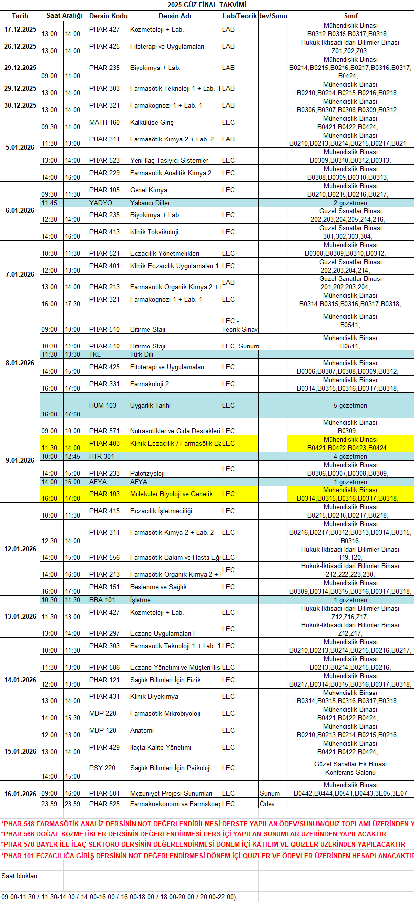 This schedule includes the examination dates, times, and examination venues for the 2025/2026 Academic Year Fall Semester final exams of the Faculty of Pharmacy.